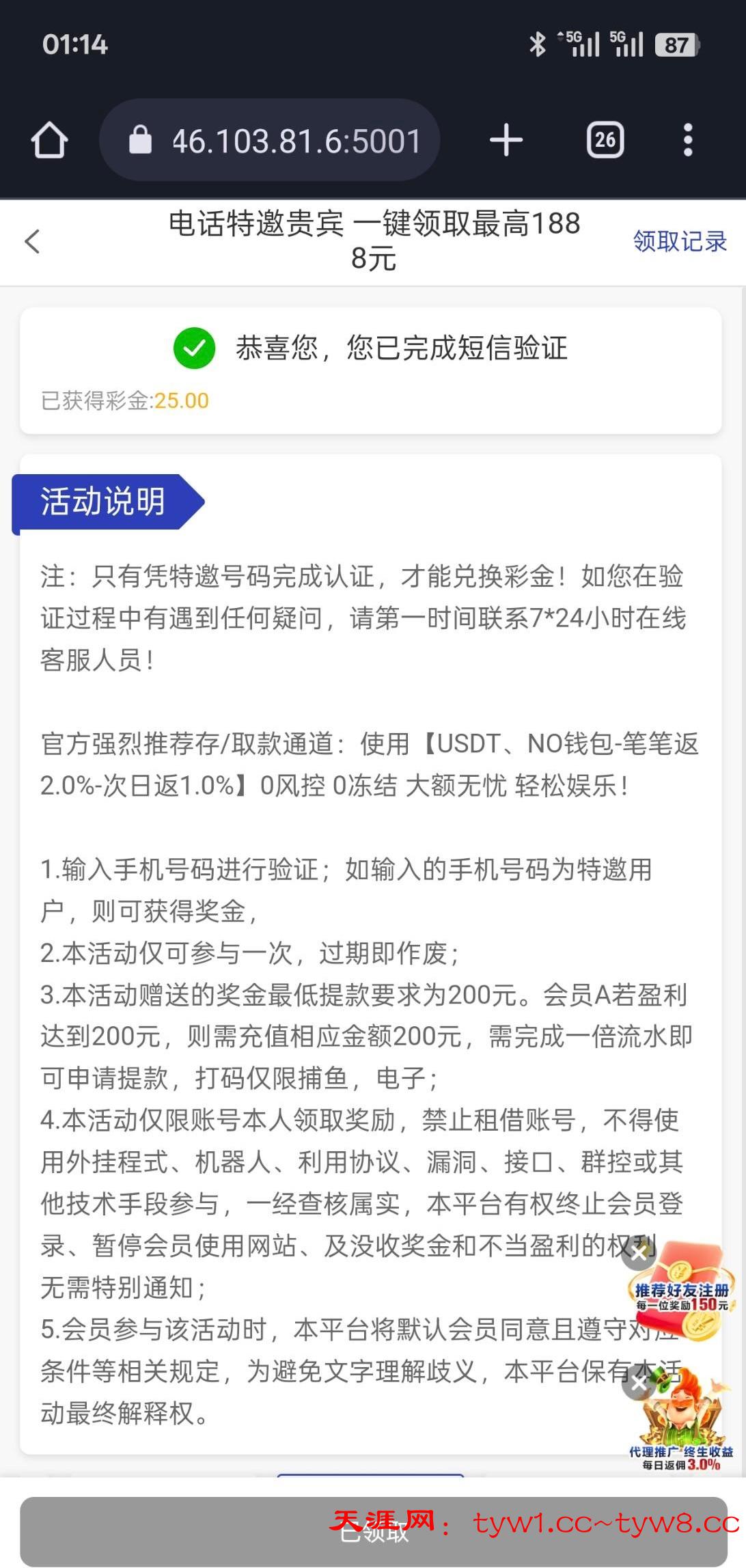 pg.vip,看见老哥说这个有50+54,想打,结果看见有特邀,印象里记得好像有号,但是没登录上,注册了一个试着领一下结果领到了25,老哥快冲,我还没打不知道黑不黑,提现要充值的话就藏分试试